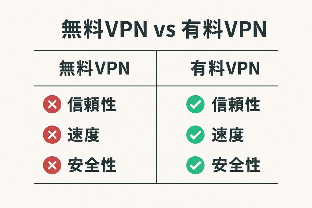 A. 無料VPNは通信速度が遅かったり、広告が表示されたり、個人情報が抜かれるリスクもあります。信頼できる有料VPNを使う方が安全です。